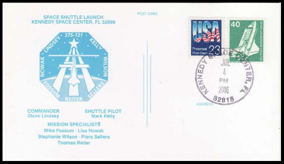 Startkarte mit Crew-Logo der Shuttle-Mission und deutsch-amerikanischer Mischfrankatur (mit deutscher Shuttle-Marke!) sowie Handstempel des Kennedy Weltraumzentrum 04.07.2006